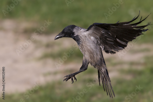Fototapeta premium A hooded crow (Corvus cornix) in flight in the city park of Berlin. In the daytime with in the background trees and gras.