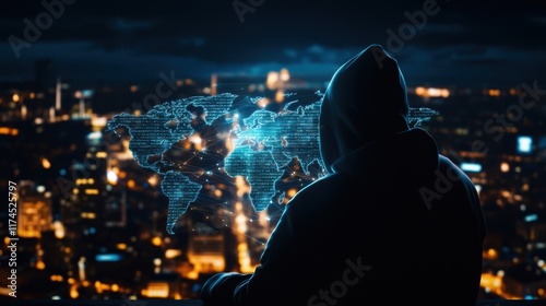 Fototapeta premium A hooded figure gazes over a city skyline, illuminated by digital maps, symbolizing technology, surveillance, and global connectivity.