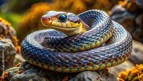 © Sandra, Fototapeta premium A hooded snake coils menacingly on a rocky outcropping, its dark brown and yellow markings blending with the shadows, scales glistening in sunlight.