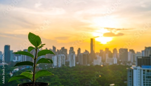 © Domurigu, Obraz premium A hopeful symbol of new beginnings, a small green plant sapling thrives against the warm golden glow of a sunset over a city skyline.