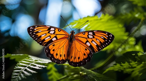 Obraz premium A horizontal image of a butterfly with orange markings on a twig