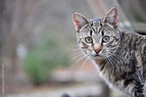 Fototapeta premium A horizontal portrait of a brown tabby cat with green eyes looking at the camera