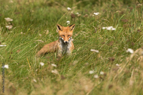 © Patrick, Obraz premium A horizontal portrait of a red fox sitting in a field of grass surrounded by white flowers.