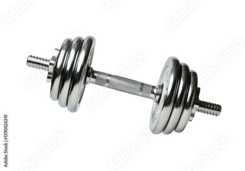 Fototapeta premium A horizontally floating dumbbell with a chrome finish, on a solid white background