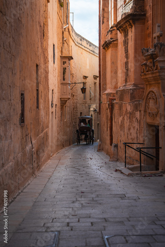 © Aerial Film Studio, Fototapeta premium A horse drawn carriage moves along cobblestones in Mdina, Malta, beside honey colored limestone, iron balconies, and arched doorways in warm afternoon light.