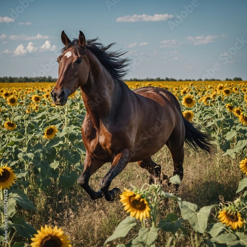 © Atif, Obraz premium A horse galloping through a field of sunflowers on a clear day.
