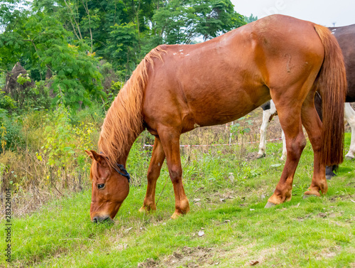 © Weiming, Fototapeta premium A horse grazing on the grass by the river
