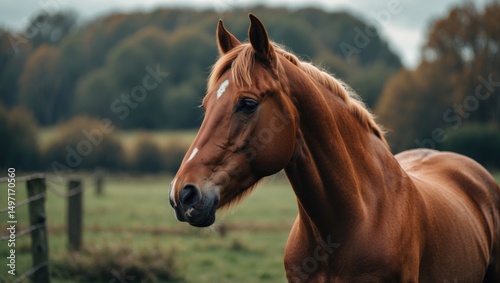 © Sona, Obraz premium A horse in a pasture with trees in the background.