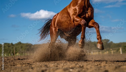 Obraz premium A horse in motion kicking up dirt and sand, dynamic action scene with ample...