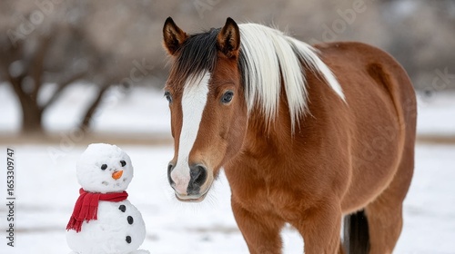 © Nataliia_Trushchenko, Fototapeta premium A horse is standing in the snow next to a snowman. The horse is brown and white, and the snowman is made of snow. The scene is peaceful and serene, with the snowman