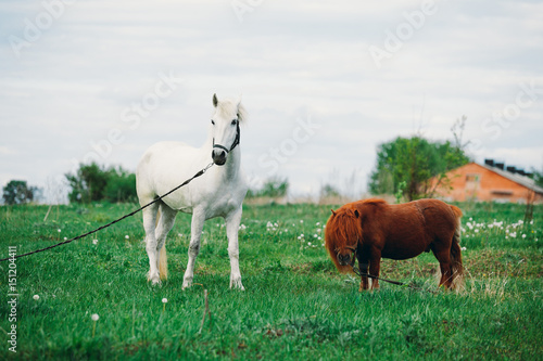 © Sergey, Fototapeta premium .A horse on the grass pony eats looks at the camera