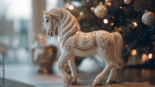 © Yahor Shylau , Naklejka premium a horse statue against the backdrop of a Christmas tree.