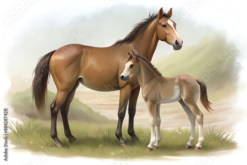 © Aqvarelka, Fototapeta premium A horse with a foal on a white isolated background.