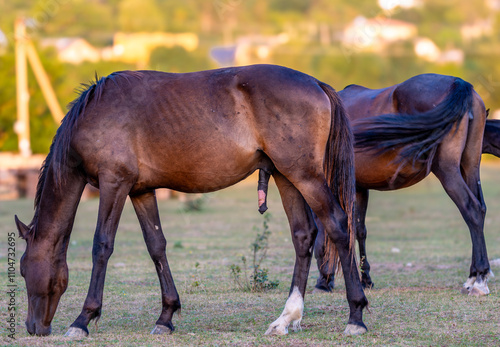 © Сергей Лаврищев, Obraz premium A horse with an erection in a close-up field.