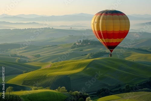 © grey, Fototapeta premium A hot air balloon drifting above rolling hills, with a softly blurred background of green fields and distant mountains.