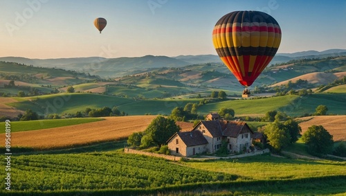 Obraz premium A hot air balloon drifting over a picturesque countries