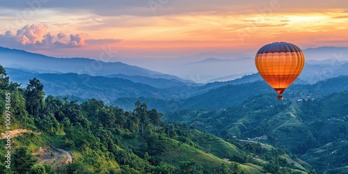 © Tevarplus, Fototapeta premium a hot air balloon flying over a mountain