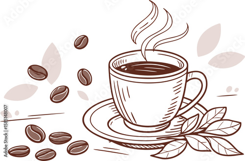 © S43, Obraz premium A hot coffee cup with steam and beans, a perfect morning beverage