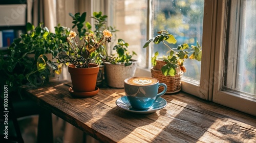 Fototapeta premium A hot cup of latte with beautiful art, sitting on a cozy wooden table by a window filled with natural light for a comforting scene