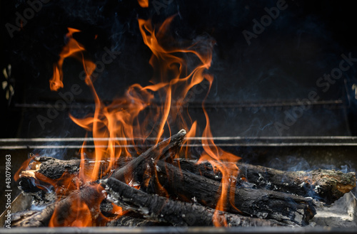 Fototapeta premium A hot fire in barbeque on a black background. Summer bbq concept