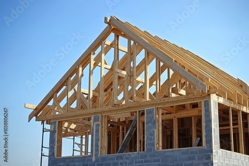Fototapeta premium A house being built with a timber truss AAC block walls unfinished window spaces a brick lintel scaffolding and a clear blue sky