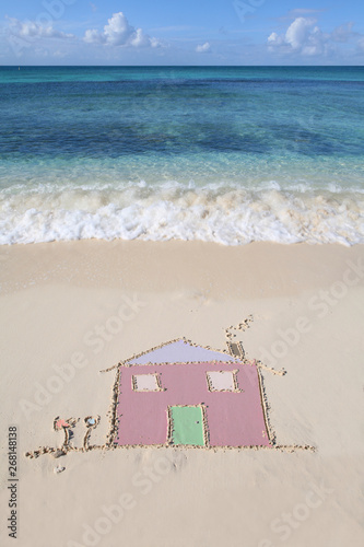 © allister, Fototapeta premium A house drawn in the sand on a beautiful sandy beach with waves lapping the shore. Symbol of moving house, moving overseas, new life.