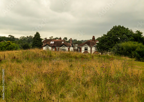 © Marcos, Obraz premium A house in a field of tall grass under a cloudy sky.