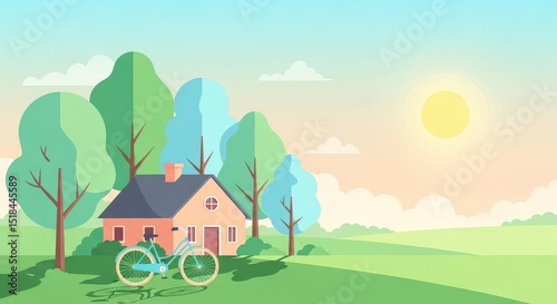 © Katsyarina, Fototapeta premium A house in a green field with a bicycle and natural landscape. Summer day for real estate and healthy lifestyle.