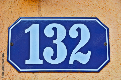 © Boris, Obraz premium A house number plaque, showing the number one hundred thirty two (132)