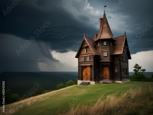 © JIANG CHENG YOU, Fototapeta premium a house on a hill with storm clouds in the background.