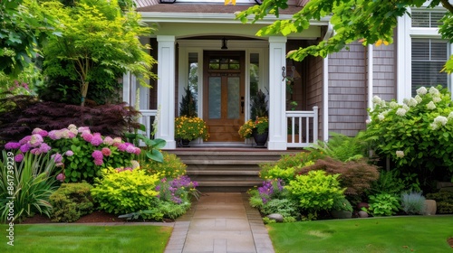 © Dumrongkait, Fototapeta premium A house with a beautiful garden and a white porch. The garden is full of flowers and plants, and the porch has a wooden railing. The house has a welcoming and inviting atmosphere