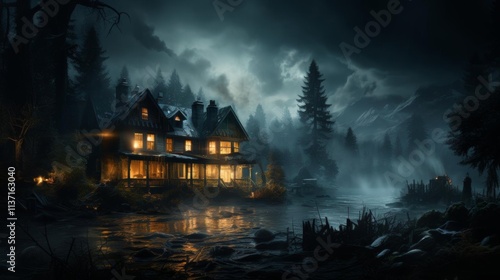 © SP_Da, Fototapeta premium A house with a porch and a lake in the background