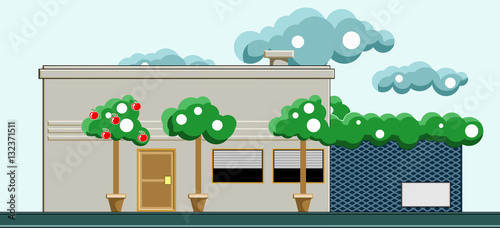 Fototapeta premium A house with front trees and clouds in the sky. Vector flat