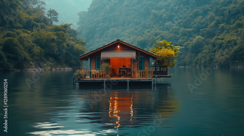 Fototapeta premium A houseboat on the river standing modestly among g_004