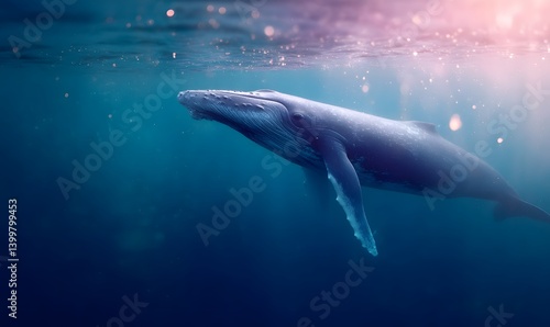 Fototapeta premium A huge blue whale swims close to the camera, Generative AI