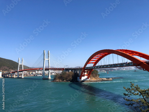 Fototapeta premium A huge bridge connecting the mainland and islands located in Sacheon, South...