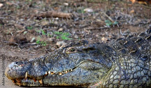 Obraz premium A huge crocodile resting on the shore of a hippo pool