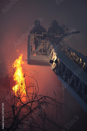 © Ingus Evertovskis, Naklejka premium a huge fire with firefighters in action