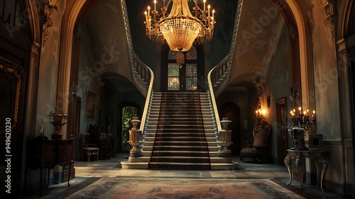 © QAISAR, Fototapeta premium A huge hanging light and an enormous staircase in a grand doorway