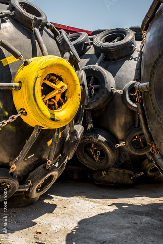 Fototapeta premium A huge Marine Pneumatic heavy rubber fender surrounded by tires fixed with...
