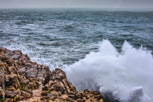 Fototapeta premium A huge ocean waves breaking on the coastal cliffs in at the cloudy stormy...