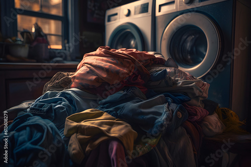 © aapsky, Obraz premium A huge pile of clothes and dirty laundry in the bathroom near the washing machines. Generative AI