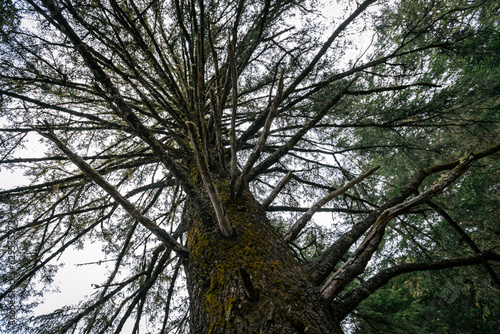 Fototapeta premium A huge pine tree trunk looking up in high altitude forest