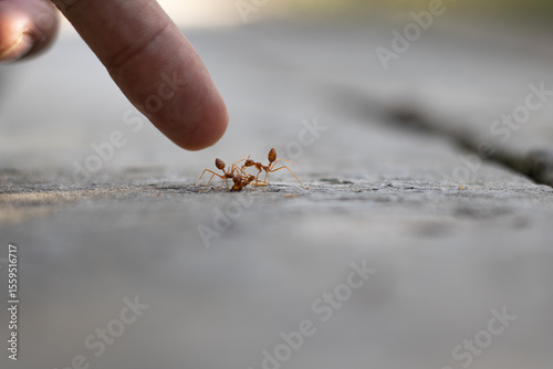 Fototapeta premium A human finger points at two weaver ants fighting or interacting on a wooden surface. A powerful conceptual macro photo about conflict, intervention, and power dynamics.