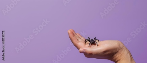 © JK_kyoto, Obraz premium A human hand holding a small deer figurine against a solid beige backdrop with ample copy space