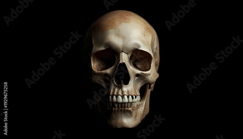 © ai_artist, Fototapeta premium A human skull is shown against a black background in a close-up view.