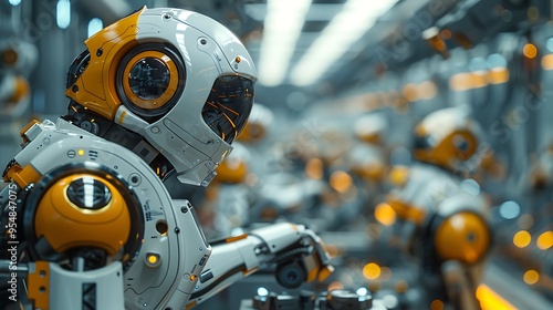 Fototapeta premium A human technician and a robotic arm in a sleek, futuristic factory, collaboratively assembling a complex machine component. The environment is clean and technologically advanced,