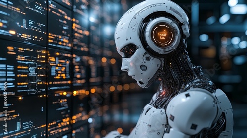 © Arieswanto, Fototapeta premium A humanoid robot analyzes code on a screen