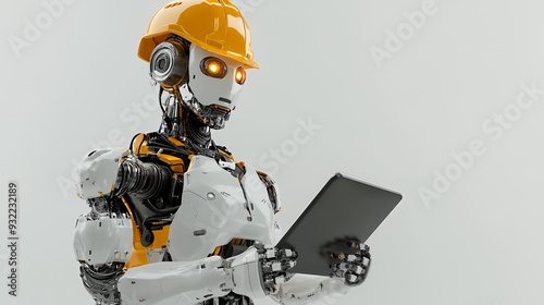 Fototapeta premium A humanoid robot in a construction helmet holding a tablet.