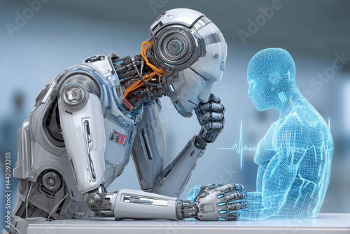 © Dadee, Fototapeta premium A humanoid robot interacts thoughtfully with a holographic human figure, symbolizing AI-human connections and advanced technology.